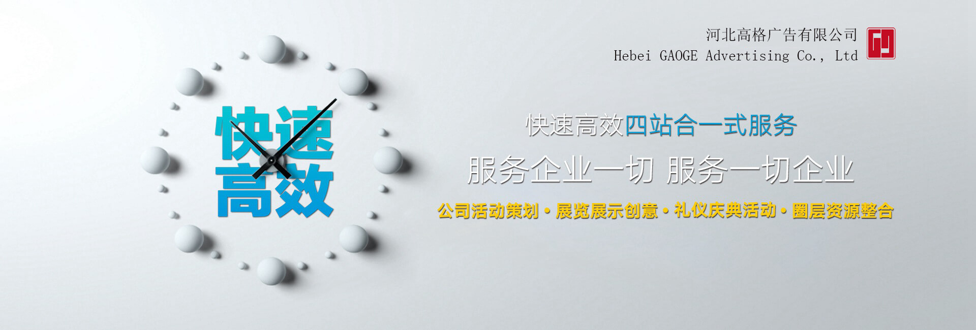 河北高格廣告有限公司是一家專業致力于大型文化活動組織策劃、展覽展示工程策劃、展臺設計制作、特裝展臺搭建、會議會場布置、巡回展覽、路演、公關推廣執行、會議慶典禮儀、路演設備租賃、倉儲等一站式的專業服務公司。本公司憑借創新領先的服務理念,大型的廠房空間,現代化的機械設備,高素質專業的服務團隊,及在該行業多年的實戰經驗,為地產營銷提供了優秀的活動方案、為不同行業的數千家企業提供了專業個性化的空間展示方案,幫助客戶實現了自我品牌的提升和企業利潤的雙贏。...